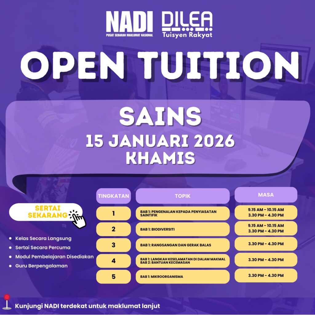 Jom sertai Open Tuition bersama NADI DILEA Tuisyen Rakyat! Kelas ini adalah PERCUMA dan dikendalikan secara langsung!